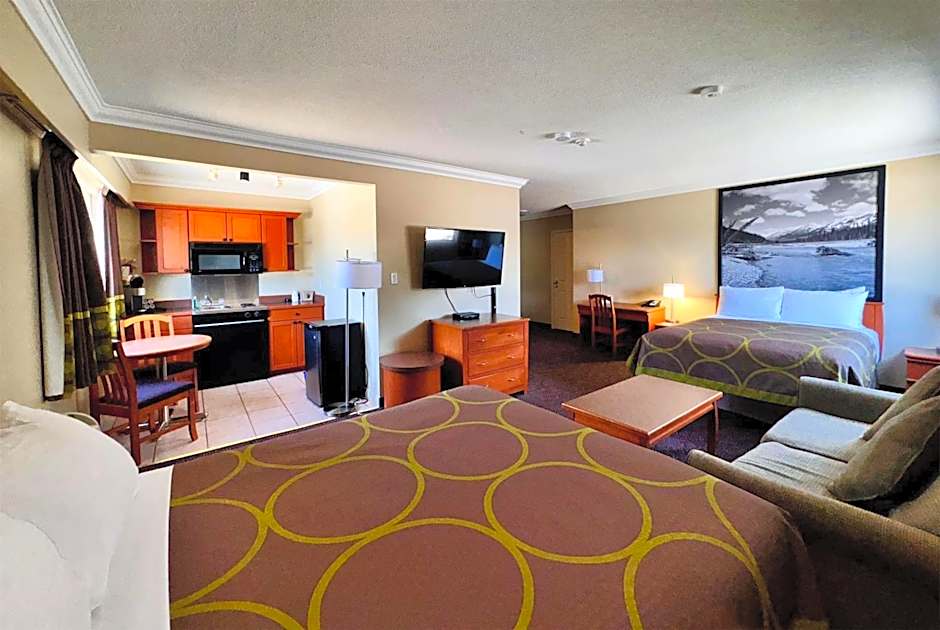 The suite provides air conditioning, a tea and coffee maker, as well as a private bathroom featuring a bath and a shower. Guests can make meals in the kitchenette that is equipped with a stovetop, a refrigerator, a microwave and a toaster. The suite offers a seating area, a carpeted floor, heating, as well as a flat-screen TV with cable channels. The unit offers 2 beds.